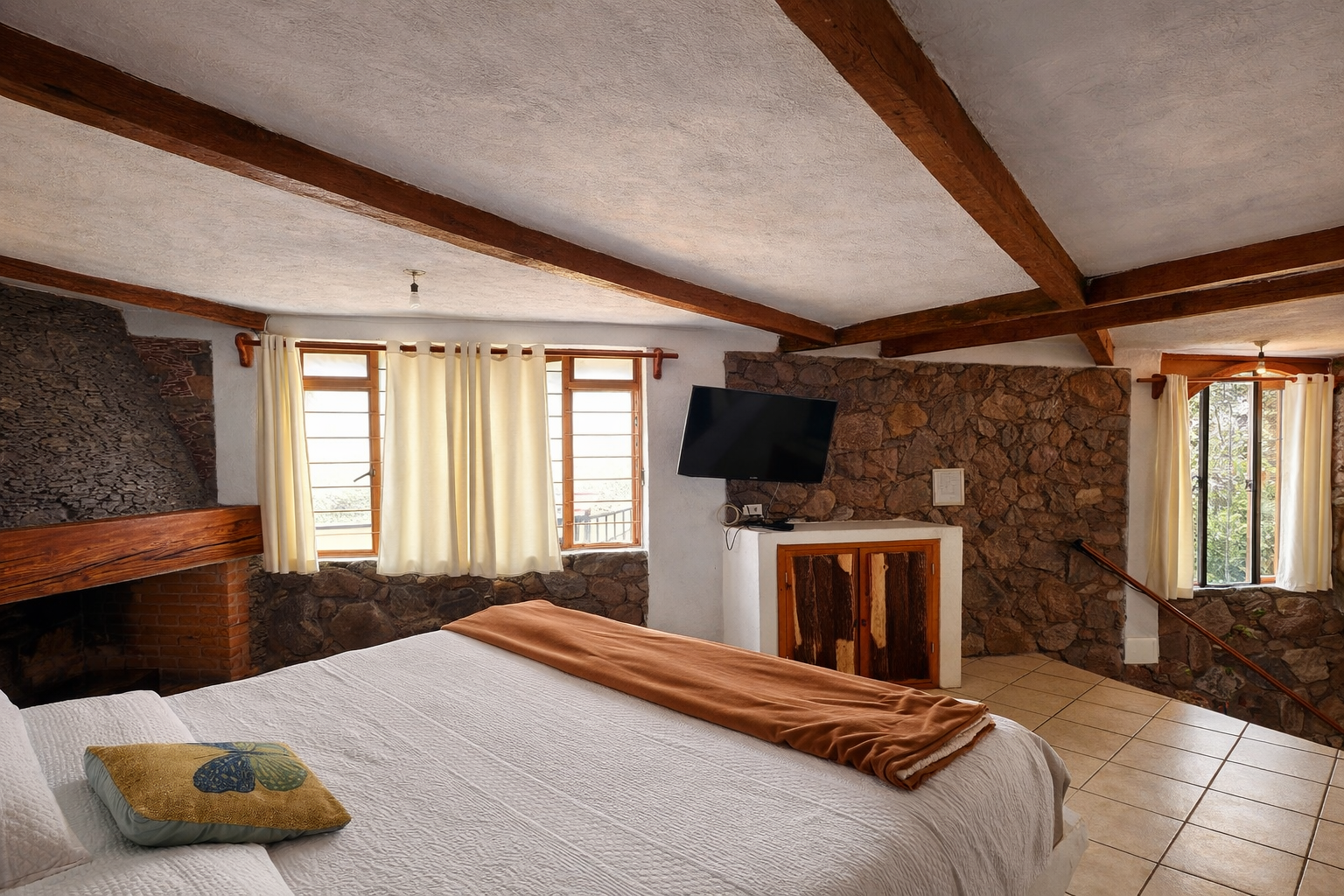 La Piedra es una cabaña amplia y cómoda, ideal para grupos de hasta 8 personas. En planta baja cuenta con recámara con cama King, baño completo, cocineta equipada y sala con chimenea. En la planta alta ofrece dos recámaras adicionales, una de ellas con acceso a terraza al aire libre con asador y comedor. Un espacio funcional y acogedor, perfecto para disfrutar Valle de Bravo en familia o con amigos.