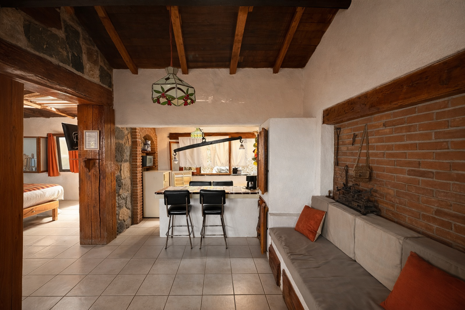 Suite Taos es una suite amplia y versátil para 2 a 6 personas, ubicada en una de las avenidas más emblemáticas de Valle de Bravo. Cuenta con cocineta equipada, área de bar, sala con sofá cama y una terraza con vista a la vida local. Dispone de dos habitaciones, una con cama Queen y otra con cama King, ambas con baño completo y espacios confortables. Su ubicación privilegiada permite disfrutar el Centro Histórico, el lago y el pueblo caminando, con total comodidad.