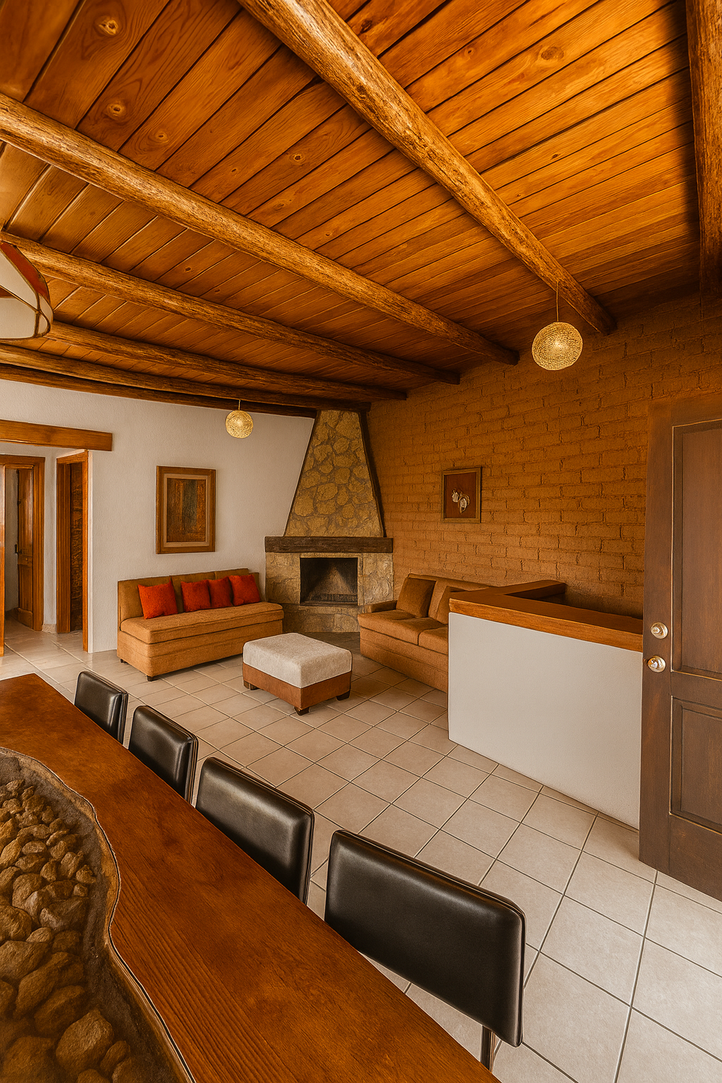 Casa Grande es la cabaña más amplia y exclusiva del complejo, ideal para grupos de hasta 8 personas. Cuenta con sala amplia con chimenea, cocina completa y comedor, creando un espacio perfecto para convivir. En la planta alta ofrece recámaras confortables y una zona privada con jacuzzi para seis personas y pequeña alberca. Su ubicación céntrica brinda la mejor vista al lago de Valle de Bravo y atardeceres verdaderamente inolvidables.